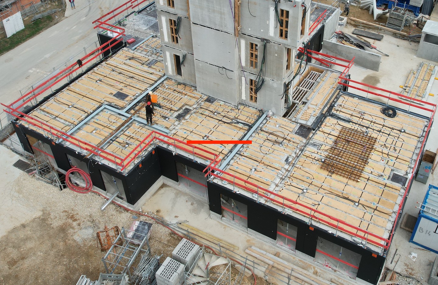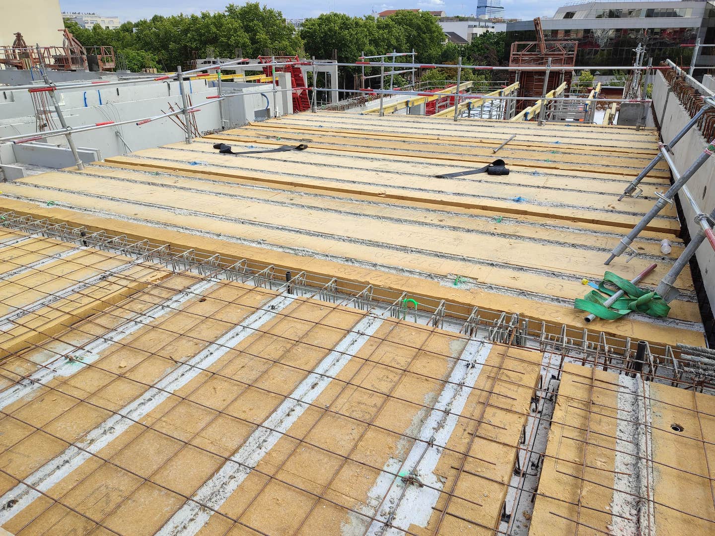 C'est une dalle nervurée préfabriquée en béton armé bas carbone, dont l’espace entre les nervures est comblé par des panneaux d’isolant biosourcé en fibre de bois du type PAVAWALL-GF de PAVATEX by SOPREMA.